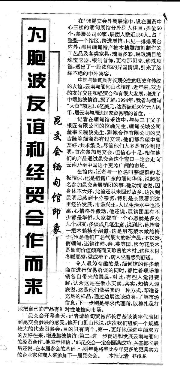 我们这次参加昆交会损失不少。那些断了尾、断了脚、断了鼻的大件雕刻物品只好留在边界。留在我亲家高景山先生旅馆的仓库里。然后调雕刻师们前往修理,之后在边界城市低价售出。通过这次参加昆交会,也得到了不少的参展经验。