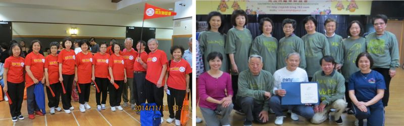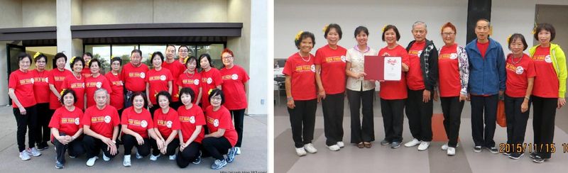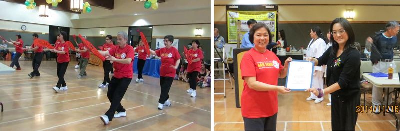 我记得这活动我们是在2014年开始参加的。二零一四年十一月十四日,在9108 Garvey Avenue Rosemead CA 91770 的 Garvey Center, 我们像参加奥运的选手们,高举着“南友”的红旗 (谢志超校友制作) 进入会场。这一进场式我们进行了无数次排练,要求整齐雄壮气宇昂扬。我们参加的项目是: 太极功夫扇。经过雷倩美老师的一次又一次的反复教导,大家觉得太极功夫扇的五十二动作已很有把握。但这是要参加比赛,老师还是加班加点,把要表演的会友召集好,严严格格地把每一个动作做到标准优美。出场那天,记得我在前面带头走出,没听"向左转"的口号就左转了,赶忙又转回去。紧张嘛,猜想大概没人看见,愚人之慰,真好笑。 大家表演尽力,关扇开扇还算整齐,没有响马后炮。这真是意外的惊喜,想不到还拿到了奖。听到喊 “南友”的名字,我马上冲出去接了奖状。奖状是 “Best Demonstration of Cardio Activity”。真的,除了脑子尽量使手和脚协调以外,心脏比平时候跳得还快。由胡德林先生Max Hu 奉献的 T-shirt,在我和侄女们的制作下,手工写上“We Are Number One” ,做为纪念 送给每一位参与表演的会友,表示对大家的鼓励,真的,"我们是第一"。