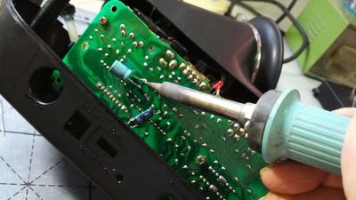 “工欲善其事,必先利其器”。我将旧MP4播放器改造成信号源,把盒式助听器改装成信号寻迹器。用信号源判断音频前置和功放工作正常,这部分电路不用再去理会;用信号寻迹器判断出,音频润色电路的管乐模拟信号不正常。初步判断是电容器失效漏液,以及吹奏气流管道结露的水分,日积夜累,造成线路板漏电的软故障。音频润色电路板是双面SMD贴片电路,在业余条件下,只能从印刷版表面用肉眼进行清理。先用无水酒精擦拭,但印刷版上的助焊剂被酒精溶解后,又形成了一层薄薄的粘液覆盖在印刷版上,这样适得其反。
