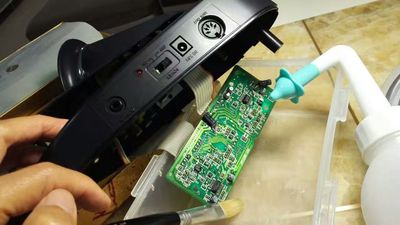 后来,联系了远在大洋彼岸的胞弟,建议大胆用水清洗。无奈之下,用他指点的方法,用洗洁精和自来水重点清洗CPU、贴片IC、排线接头……,然后用电吹风吹干,接通电源后,一切恢复正常!通常认为电子产品是最忌讳水的,现在却是水焕发了它的活力!真可谓“水可覆舟,亦可载舟”啊!