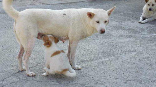 点灯节月后,白姑娘在家产下第一胎8只狗仔,有周身棕毛,也有棕白花毛,应了陈先生的预言,可乐坏了我的儿子,他成天逗小狗玩个不停,主人如此爱抚狗仔,看得出来白姑娘十分高兴。小狗生出来眼睛未开却能找到母乳吸吮,小孩吃奶咀含乳头,小狗吃奶却张开大口,咀含乳房,十分奇特。随着狗仔们逐渐长大,吸食奶水增多,白姑娘更加辛苦,除增食家里的食物,也常出外找其他食物。初生的狗仔总依偎于母亲身边或互相抱成一团,后来除吃奶,晚上睡觉挤在一起,其他时间他们开始到处走动,学吃食物。逐渐減轻白姑娘供奶负担,同时也增加我们的供食负担。