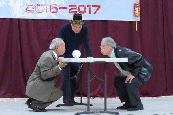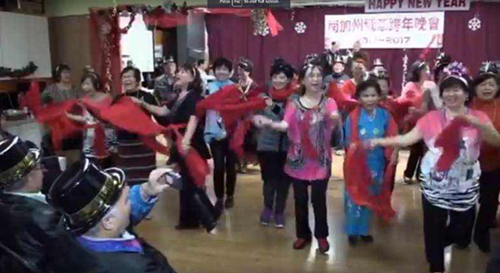由于跨年时间未至,大家在庄玉娇老师引领下,排成一排排,跳起排排舞。接着围成一个大圈,手搭肩、脚跟脚,热热闹闹跳起圈圈舞。此时,6个团体的12位代表登上舞台,手握香宾酒.口呼倒计数。大众欢呼声中引来了吉祥如意的2017新年,小喇叭吡吡响,小鞭炮嘣嘣叫,互相敬酒祝福声洋溢满堂,跨年晚会达到最高潮。