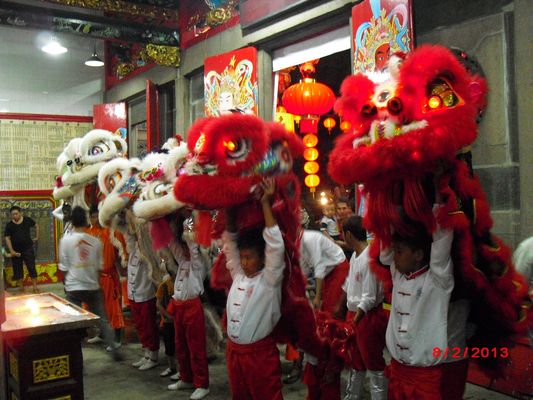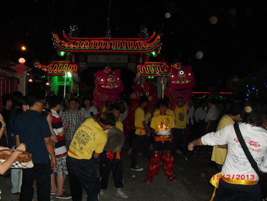 舞狮队是华人过年中一大特色,贯穿着过年过节的始终,雄浑的鼓声和铜锣声,总是激励人们心弦,虽然发音单纯,却是浑厚而有力,人们百听而不厌,瑞狮就伴随着其简单而有力的节奏起舞,表现着中华文化、表现着中华民族的智慧、勇敢、雄伟。无论在哪里,总有人驻足观看。在只荷坦街举办的瑞狮队擂台赛,更是围堵着多少观众,水泻而不通。这里是年青人的世界,充满着活力,充满着青春气息,衬托着华人春节、充满朝气和希望。