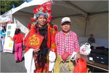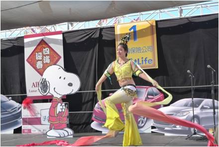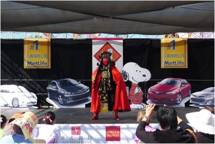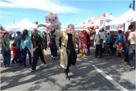 是日天亮前, 当地警察早已将山谷大道约五百米路段封闭, 各庆祝团队及商家赶在天亮时集结佈置就绪。笔者上年9时许赶到现场, 自西至东首先进入眼簾的是飞龙等电动游乐场, 由于时间尚早, 还沒有多少儿童进入。接着是连绵不断, 左右并列的小摊位, 有推销各种餅盒, 食品的, 厨房用品的, 家庭生活用品的, 均比平时价格优惠, 品种齐全, 琳瑯满目, 吸引游客, 已开始有三, 五成群游客在选购。到了正中, 中心有午台, 各演出队伍, 粉飾彩装, 磨拳擦掌, 集中待演。再过去是美食攴飲店, 各种美食热气腾腾, 香味扑鼻, 令人垂涎, 已开始有人进出。往前走是优惠照相, 花草盆栽, 服装首飾, 净水设备, 中文纲络影视, 銀行开户, 家电手机, 医疗保健, 总之, 种类繁多, 数不胜数。