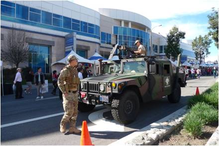 由于今天天气特别晴朗, 气温适度,不冷不热, 尽管成千上万人拥挤不堪, 並不见发生任何意外, 需要救护员帮忙, 场地两头有警员值班, 秩序井然。洛城路军收兵站的兵哥们也前来开摊位, 招募新兵, 摊前还停一辆军车宣传, 特别搶眼。笔者还特地走进免费保健站, 请护理员测试血压, 体内含氧量, 一切正常, 十分满意。