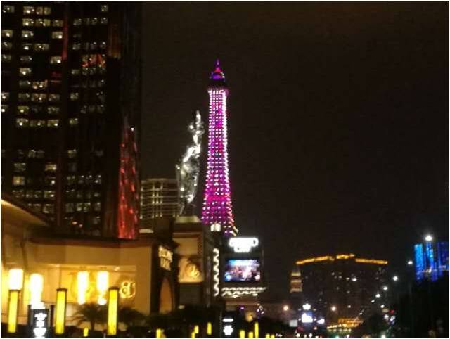 晚会结束,回到下榻的“励庭海景酒店”,原仰光中国女中的校友尤女士自驾车载我们走马看花观赏澳门夜景,新葡京、威尼斯人、巴黎埃菲尔铁塔等金光大道上灯火辉煌的夜景,美不胜收。它们大部分均为1999年澳门回归祖国后建造的,见证了澳门实行“一国两制”的成功。