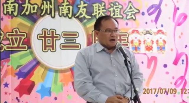 今年庆会贵宾是新上任的母籍国缅甸驻洛杉矶领事馆总领事宇旺梭温贤伉俪,总领先生在会长邀请上台赠言,总领先生表示这是笫二次来到这个礼堂,在異国他乡能和至亲同胞相见,为大家工作,感到非常高兴,诚恳地祝胞波们身心愉快健康。