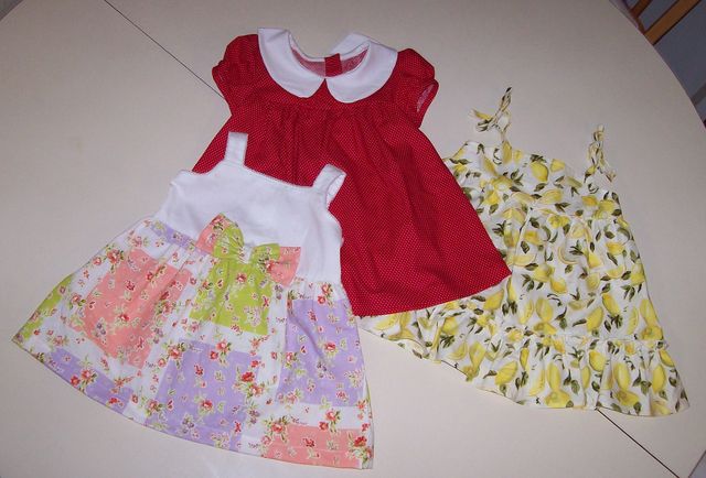 只見:一件大紅小白細點燈籠袖小洋裝配上白色圓領、一件大花兩層荷葉短裙配以蝴蝶結、一件黃色檸檬花樣無袖荷葉邊洋裝、一件上身白色下身三色補丁花的小衣裙配以兩色蝴蝶結、一件…… 其中一件是以一條漂亮紅綠花色的手巾做成的背心(Tank Top),依照手巾邊沿的特色剪裁成菱形的下擺,配以桃紅色肩上蝴蝶結,漂亮又別緻。對著這些小不點的成品,越看越可愛,不盡有點王小二賣瓜,自賣自誇起來。