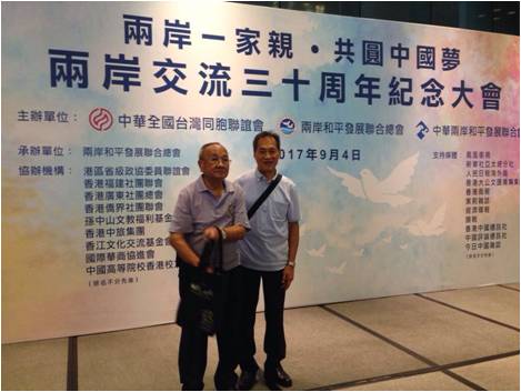 9月4日由中华全国台湾同胞联谊会、两岸和平発展联合总会和中华两岸和平発展联合会(台湾) 联合举办的「两岸一家亲,共圆中国梦,两岸交流三十周年纪念大会」,在香港会展中心举行。大会的组织包括:主办单位、承办机构、恊办单位等9个团体,以及支持媒体11家。参加的嘉宾约计千人左右。汇集了两岸四地,关心两岸关系发展,促进合作,为实现祖国统一事业的有志之士,真是高朋满座。