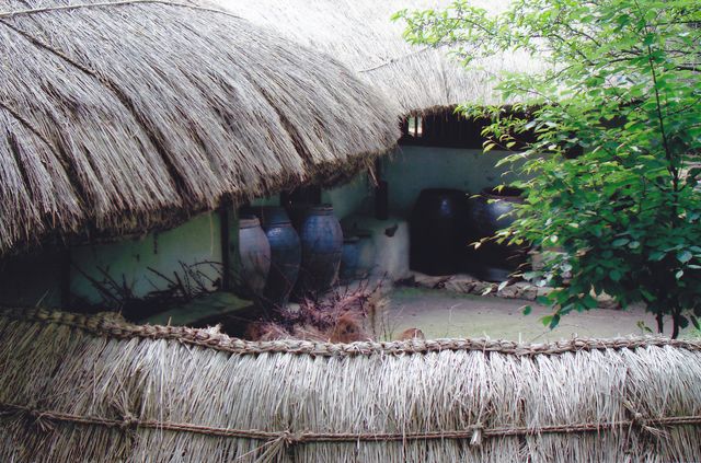 古代韩式建筑物:-----普遍采用木材泥巴, 屋顶覆盖厚厚的茅草, 异常简陋. 日常用品多数用陶泥制造, 难得一见精美瓷器餐具. 只有富贵人家才能享用砖瓦房舍, 贫富极为悬殊. 勿小嘘这不起眼的小陋室, 门前均贴有寓意吉祥的对联. 可能深受中国文化长期的熏陶, 对联一律采用中文毛笔书写, 兹将其抄录如下: