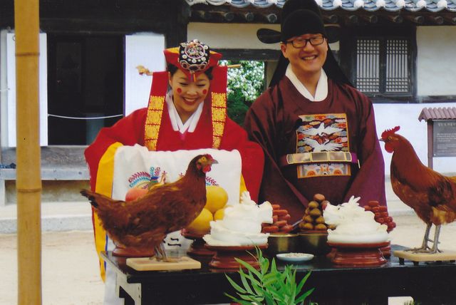 韩式婚嫁仪式:-----堂侄女与一韩国小生共谐连理, 他们选择在民俗村举办一次别开生面兼隆重, 富有韩国色彩的传统婚礼. 头饰, 服装百分百韩式, 连新娘娇嫩的脸蛋也贴上小小的红纸, 如此打扮令人感觉怪趣异样. 新郎新娘穿上传统服饰, 在民俗村内某个指定的特别场所举行婚礼. 百多个小学生, 游客也乘兴而来观看这引人入胜的韩式婚嫁. 婚礼开始,由穿上白袍的男主持人致祝颂词, 婚礼现场正中间设一案头, 摆上烛台, 两只母鸡, 果品, 一对木刻鸳鸯, 新郎新娘分立两侧, 新郎两旁站立两位男士, 女的亦然, 由这两男两女协助行礼如仪, 礼毕在村内品赏美食, 拍照留念. 经过如此繁文褥节, 终究完成了人生的一桩大事.