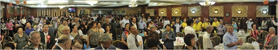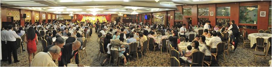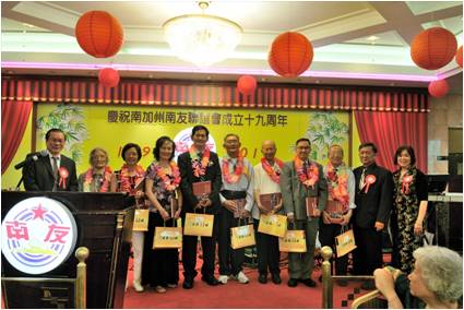 宴会大厅的舞台,布置的美观大方,台中央鲜明精致的“南友”徽章,格外醒目。“庆祝南加州南友联谊会成立19周年”大横幅,和下方1994-2013几个大字,显示了南加州南友联谊会创立成长壮大的历程。台下座无虚席,欢声笑语,浓浓的校友情谊,洋溢在整个大厅。