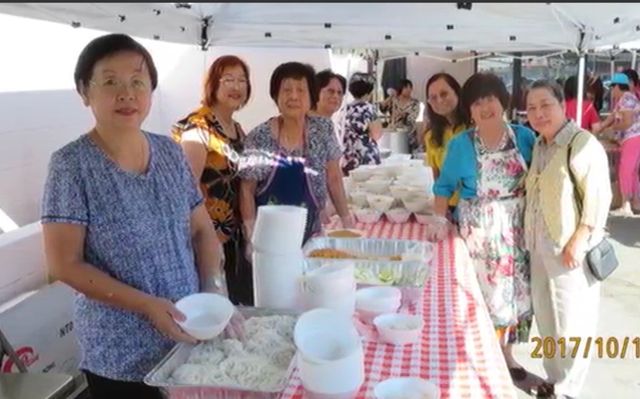 大埕上弥漫着阵阵扑鼻而来的思乡鱼汤米粉香味,五彩缤纷的故乡甜品诱人垂涎,整治攴食的大姐们,心手相应,欢笑连连。跟随手托攴盘汲汲忙忙的义工们,踏着朗朗的笑声走进礼堂,滿堂四排长长的桌椅已坐满童颜鹤发,仙姿佚貌的长庚耆老,桌上摆有鱼汤米粉,五色甜品,爽口饮料。