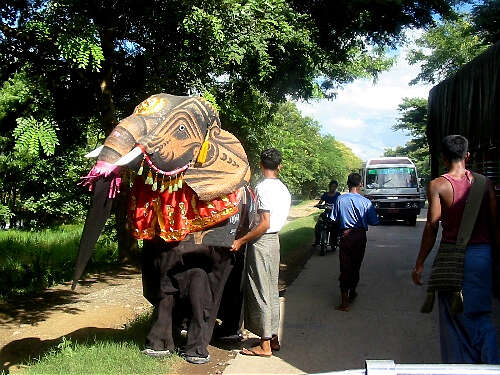 我们市民和周遭居民都非常执着,一岁二岁孩子们听到“叭呗咚”的声音就会缠着大人送,回来就摇头摆脑地跳着舞。成年就都亲自下海跳,稍有年岁时看见别人跳舞就舍不得离开。是什么舞?亲们可知道?象舞……象舞……叫实象舞。从前就有钢丝胶带竹拍板,短鼓一只,唢呐一支,钹一把,一只锣,竹节拍,竹节拍可有十五支廾支。视队员多少而定。从那时就热翻了,舞象队要绕市场三圈,每个市区的舞象队,逐村的象队,个别人士组织的舞象队,长长一串头尾相衔。由市场头望去只见一大串象队。现在的更甚。乐器有电子琴,夽鼓和扬声机,大型音箱可不少,有八只之多。前年仰光名叫梭珊达吞的歌星还来过呢。真个热轰轰沸沸扬扬的。牠们象只镶上闪闪发亮的饰物,侢在十轮大卡车上,连同那位歌星绕场娱众。到比赛彩棚象会下车比赛……说是这么说,这时我们已到山上,为回来拿忘在家的大酸菜包,有杌会看了一阵子。但是,在赛程中得到笫一的象,晚上在中央授奖台上还会表演,观众们还有机会饱视仰光来的女歌星……喏大一个剧场堵满了人。中央舞台三十尺范围内,建了一座三尺高的台,灯光柱,霓虹彩灯,领头人们在台上欢颜尽露,他们被欢乐气氛宣染了。我只有在这授奖的晚会,才看到闪亮的群象,传统的象,孩子们的象,各乐团众歌星,尽受眼底,大饱眼福。今年听说请了两位仰光的歌星。这象还会得奖。晚上授奖会才饱看一顿!我有爸爸的基因,我爸是“抖扒”短鼓手。打击“抖扒”有松击,捂击,轻击,狂击,象队来时听那鼓声,爸就知道“这是哥拨鼓。”鼓哥拨,唢呐魏雅,这一搭挡一入斋戒期到结夏一个月期间难得有三,四天休息”。这还是爸说腿酸脚疼,是呵!整市一区一区地前导象舞后随竹节拍队,吹吹打打的乐队,最前面是大艮钵。这还要说,队员们大家聚集款项,收象,捐款,得到的善缘,分配那只象到那间佛塔布施香火。晚上持戒聆经。那个时期一升米才三块五十分。爸跟队每晚得十五块报`酬,三个斋戒月在象队敲打收获颇丰,得有储蓄。