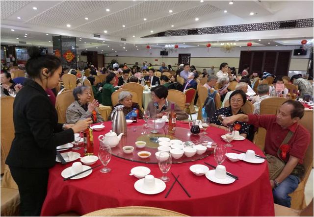 缅甸在广州的留学生,缅甸教师和在广州外语学院学习缅语的中国学生,广东省侨务办公室的领导等嘉宾陆续达到会场。港澳和广东各地的归侨们也陆陆续续地进入宴会厅。大厅里人头攒动,欢笑声歌声此起披伏,到处洋溢着欢快的氛围。各道菜肴陆续送上餐桌,大会组织招待的非常周全。很是丰盛。