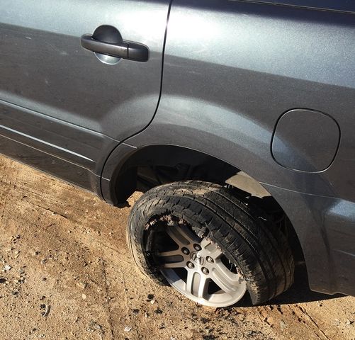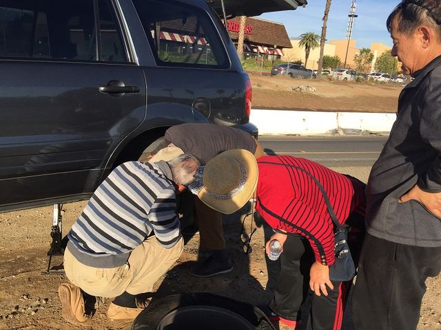 离开护理院时已是下午2点半,车子开上10号高速不久,忽然听到唦唦的声音,开始以为是路面不平滑,然而声音却很快地越来越大,不好!一定是轮胎出事了!阿才首先出声,老丘赶紧从左到右换线,所幸当时车辆不多,很快就开到 Citrus Ave的出口旁的一块空地停下。下车一看,大家都惊呆了,OMG! 只见左后轮已暴裂到不成形,轮胎的钢圈完全暴露并深陷在沙石的平地上。