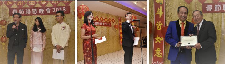 该会会长:黄国盛先生首位上台,他一口流利英语,向到会各位来宾致贺道喜,谢谢大家莅临助兴,增添春意。仅此向大家道了声:「新春快乐!」。接着该会董事长:许秉正先生致贺词:他说:「大家晚上好!」(一阵热烈掌声。),「我代表南加州缅华联谊会 董事会 热烈欢迎大家来参加我们的春节联欢晚会,」(经久不息的掌声回应),「今年我会将举行每两年一次的董事选举,我们欢迎有意参选的会友们前来登记参加选举。我们特别欢迎年轻的会员们来参加我们的活动和加入我们的领导团队。我在这里祝大家身体健康,新年快乐,万事如意,狗年吉祥。谢谢大家!」,欢呼声和雷动的掌声,震耳欲聋。董事长用中,缅,英三种语言向贵宾们广播祝福。副会长:栗伟民先生也问大家表达了年轻一代的祝贺。随后,财政:曹雪清女士作了详尽的财政报告。