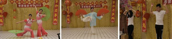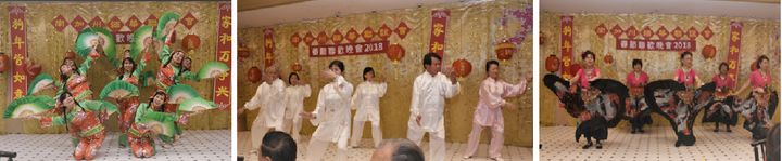 今晚余兴节目参演单位及节目有:本会瑞狮组的“狮舞”,本会文娱组的“恭喜发财”,“辣妹子”,“江南之恋”,“拉丁舞”。武术指导雷倩美的“太极双扇”。本会青年组的“迈克杰森之舞”。钻石吧长青民族舞蹈班的“大地飞歌”。南加州南友联谊会“24式太极拳”,缅甸人协会的“歌伴缅族舞”。皆是精挑细选,粒粒晶莹。舞蹈;轻歌曼舞,婀娜多姿,酣畅淋漓。舞者;袅袅婷婷,衣袂飘飘,美不胜收。在这满堂殷红,莺歌燕舞,喜气洋溢的春宴,人们享受到了和平的红利,安定的幸福,生活的美满。