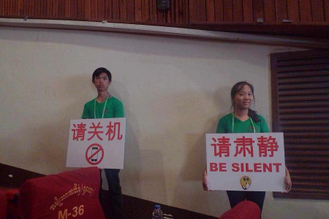 庄严隆重的第九届世界缅华同侨大会,在播放高唱缅甸国歌中开幕了,大厅上下挤满了贵宾代表,两旁各站一对男女青衣服务员,他们胸前双手提起"请肃静","请关机"提醒纸牌,不失礼貌,时刻提醒大家保持安静,格外醒目。