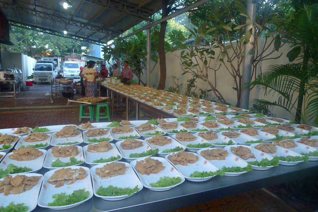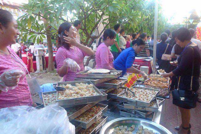 作者自然想起洛杉矶佛庙湼盘街活动,虔诚的缅甸侨民,利用佛教节庆,自发烹饪缅式风味菜肴点心,义卖食品给前来拜佛的大众,将盈余捐给佛庙。