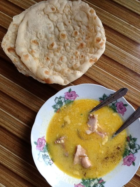 次日一早,七点半刚过,一行十多人信步走到薄饼店。见已有许多顾客在享用美味的薄饼早餐,阵阵香味扑鼻。趁等位子之际,绕到厨房参观馕的制作。只见师傅把面团擀薄贴在手上的布包模子上,往烧着火炭的大炉子内壁一贴,不久,面团发起了一个个泡泡,师傅用铁钩一挑,一个热腾腾香喷喷微焦的薄饼就出炉了。此时服务员来通知桌位已安排好,只见在店前园子的花丛旁,已用三张小矮桌拼成一条长桌,大家围坐在小矮凳上。服务员送上每人一盘香喷喷的加哩鸡,紧接着一盘盘香脆的馕薄饼端到跟前,个个急不及待用手抓起仍烫手薄饼,就着那香浓的加哩鸡,大口大口的吃了起来,一边吃一边赞不绝口“好吃!好吃!”吃完薄饼,服务员端来了又香又浓漂浮着奶皮的咖啡、奶茶,这一顿吃得实在开心、满足、过瘾。
