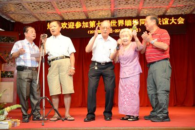 茶会上郑章良主席致欢迎词,许多同学登台发言,最引人注目的是,我们敬爱的粟秀玉老师上台训话,面对许多年过七旬的学生,毫不客气,批评大家开会不安静,在她眼里,我们永远是十七,八岁淘气学生,对每位学生,如同儿女,心怀厚爱。我们夫妇满怀激情,主动报名,登台表演缅甸双人午[乌瑞优],以致积极参与。最后,粟秀玉老师二次登台,引领校友子弟,高唱脍炙人口的缅甸乡村老歌,场面达到最高潮。仰光南友会热情邀请所有与会校友一同参加同侨大会午餐招待会。