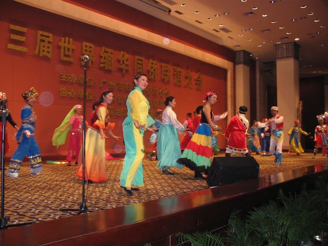 2004年9月, 第三届缅华同侨大会在祖国羊城广州举行, 晚会文娱节目丰富多彩, 正如大会总指挥陆桃香女士所言, 登台节目侨味十足, 侨情浓郁。香港团上演青年女子缅甸三人午, 午姿活泼优美。缅甸团带来 “瓦城的花朵” , 缅味全足。我们美国南加州缅华团献演庄玉娇老师领跳的拉丁午, 拉美风味突出。当午台上香港团歌手高唱缅甸歌, 六位中年女子伴午, 缅华著名老歌手陈金成上台献花并随意翩翩起午, 午姿自然柔和, 赢得台下观众热烈掌声。福建团的陈国宝古装缅甸狩猎午, 服装华丽, 动作柔美。广州团的中国女歌手, 高唱缅甸” 海鸥” 歌, 许多男女午伴扮演海鸥浪尖飞午, 别有情趣。各民族午, 演员众多, 身着五颜六色彩装, 午姿变化无穷。总之, 世界各地代表团都带来不少优秀歌午, 做到我们的文娱汇演, 我们参与, 我们同乐,演出精彩, 令人赞不绝口。