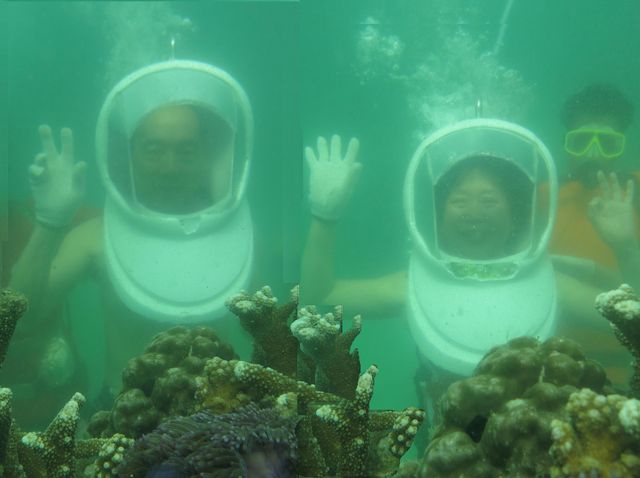 轮到我们了,脱掉拖鞋,换上他们特备的塑料鞋,头上戴了一个相当重的白色硬壳头套,直套到肩膀,正面是透明装置,样子有点像航天员的装束。接着每人戴上一只白手套,由一位指导员带着走到海上的平台边,他先示范几个手势;食指向下表示要下海底,食指向上表示要上海面,姆指食指打个圈圏就表示一切 Ok。