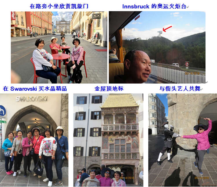 5-14-2018,昨晚夜宿奥地利 茵斯布鲁克 Innsbruck, 是1964及1972的冬季奥运举办地。这里风景优美,有金屋顶地标,有奥运火炬塔,有凯旋门,还有 Swarovski 的总部,我们在此闲逛欣赏美景,在Swarovski shopping, 还和当地的街头艺人闹成一片,十分懈意。
