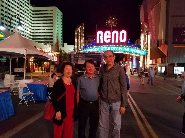 车行约三个多小时,在晚上八点半抵达雷诺哈啦赌场旅馆,黎天宝,许秉正,林碧华三位校友,帮忙大家办理入住登记手续。而后大家回自己房间安置好行李,外出寻找餐馆以祭五脏庙,然而赌场附近大多餐馆晚上九点已经打烊。初来乍到,人生地不熟,还好粟福祥老师打电话给住在附近的杨民权同学,杨民权同学接电后,全家出动,热心帮忙大家找到—家麦当劳快餐店,大家才解决了肚子问题,并带着大家在赌场附近景点溜达—会,并照了些照片留念,回旅馆住—宿。