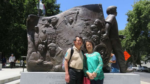 第二天—早趁早上天凉,又踏上我们的旅途,司机师傅把我们带往—处快餐店,用过早餐后,向着加利福尼亚州的州府-沙加缅度继续我们的旅程。临近中午时分,抵达沙加缅度。虽然是州的首府,城市规模不大,街道窄小,但还算宁静,整洁。车辆人流也寥寥无几,宏伟建筑,除了州府大楼外,真是屈指可数。不像洛杉矶,道路宽广,高速公路纵横交错,车水马龙,城中商业区大厦林立,人流熙熙攘攘。大家在州府大厦门前和州府广场拍照,以留到此—游印记。