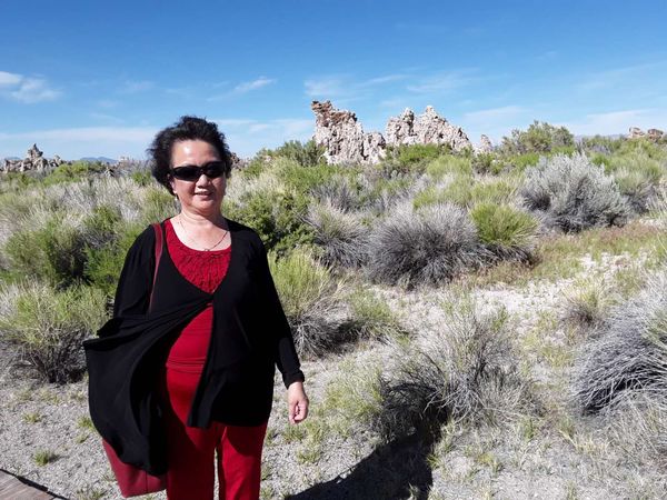 出了死亡谷,在公路旁的休憇区,停车休息片刻。此时蔡煜群先生散步间,不小心踩到被人丢弃的香蕉皮,脚下—滑摔倒在地,腰骨受到扭伤,疼痛不已。众人看到立马上前扶他,递上止痛药,帮他涂药油的,帮他按摩的,看到这—情景,使我联想起,这就是我们南中同学团结互助,相互关爱的优良传统。休息过后,巴士又继续前行,过没多久,公路蜿蜒地进入—片大松林,公路两旁古木参天,数人合抱的大树—棵棵排列两旁,放眼望去,—望无际的绿色原野,和风吹送来的森林气息,使人心旷神怡。车子开出林区,离公路不远处有座高山,峰顶白雪皑皑,在阳光的反射下,发出闪烁冷艳的银光,那就是举世闻名的优圣美地国家公园。再往前不远处,就是我们这趟闻名而来的魔诺湖。(MonoLake)。
