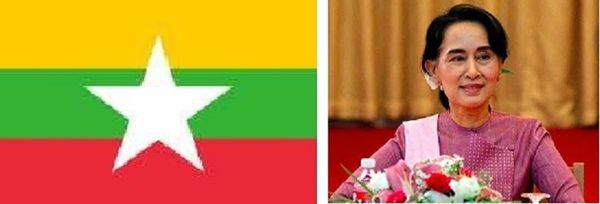 (左)缅甸联邦国旗,(右)缅甸领袖昂山素姬