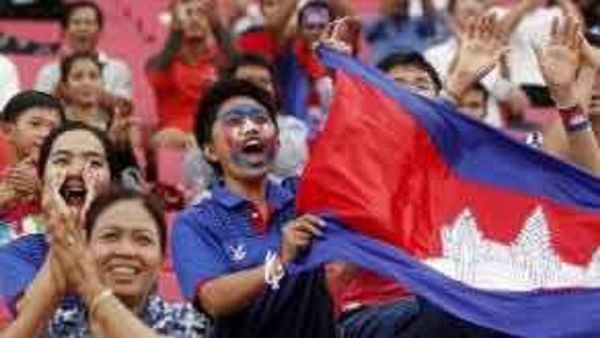 缅甸拉拉队里,很快出现巨大的国旗,绸缎黄绿蓝三色横纹,中心一颗白色五角星,徐徐飘动,美丽耀眼。那边柬埔寨拉拉队里,同样展现柬埔寨巨幅王国旗,上下蓝条,中夹宽红条,中心为吴哥窟故迹,美丽壮严。假如缅甸领袖昂山素姬,柬埔寨首相洪森,亲临现场观看,一定高兴得眉开眼笑,合不拢嘴吧。