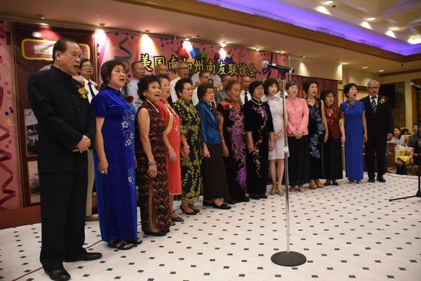 周年庆在司仪黎天宝和林碧华两位校友宣布下拉开了帷幕,晚会在雄壮激昂的校歌声中开始。江丽春校友上台指挥。“黄河浪,红星光,震撼南洋,照耀伊江,……”南北加州一同高唱校歌,歌声嘹亮,气势贯长虹。这首半世纪前由华明填词,文厚谱曲的南中校歌,是一首平凡而普通的歌曲。每当校友们唱起那轻快、刚劲、豪迈的校歌时,内心的激动,浓浓的思绪,唤起的激情不减当年。它虽然在伊洛瓦底江畔,响彻了十几年,在历史长河中可说是很短暂的。却哺育了缅甸华侨几代人热爱祖国,爱我中华。一首校歌,影响和感动了几代人。校歌是我们的精神支柱。