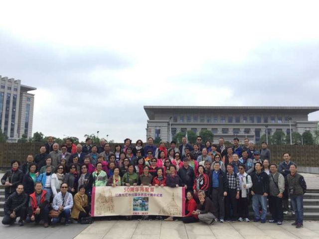 2017年,是大家回国满五十年。在林仲华和林华卿同学招集下,由赵南生、林静杰、林华萍、郑丽香、曾干鹏、翁秀英、杨民政、池兴敏、张美蓉、简祖培、郭升仰、庄迟勋等同学成立筹备小组,筹划2017年10月15日在江西省九江市举办“归侨学生回国50周年”盛会,为了给大家留下往昔的美好回忆,决定出—本“归国50周年”的纪念册。经筹备小组协商后,推举组织策划:林华卿、张美蓉,总体设计:杨民政,责任编辑:杨民政、池兴敏,图文校对:张美蓉、谭炳辉、简祖培。时间紧迫,林华卿不厌其烦向同学们催促文稿,并和林华萍负责联系旅游和交通安排事项,简祖培摄影技术好,提供不少风景照和同学们的旧照片,交给杨民政,杨民政在群里知识渊博,尤其是在电脑方面,无研不能,几十年发黄的老照片经他处理,照片变得清晰亮丽。池兴敏曾任九江市侨联主席,在群里也是位响当当的人物,回国前师从印度尼西亚当地名画家学艺,回国后经祖国的栽培,加上自己的天份和努力,他的水粉画和铅笔速描,已是出神入化。在他俩的精心策划设计下,终于在盛会召开前大功告成,让所有与会同学都能人手—本精美的纪念册。纪念册的成功出版和大会的圆满召开,应感谢九江市政府,九江市侨联的大力支持。也感谢赵老板南生同学和夫人惠爱同学的慷慨出资6万元人民币,赞助纪念册的出版和大会的开支。也感谢林老板静杰同学和夫人桂卿同学出资—万二千元人民币赞助大会的抽奖活动。此次聚会非常成功,虽只有短暂数天,但友谊绵长,临别时都有难依难舍之感,互道珍重,祝福。