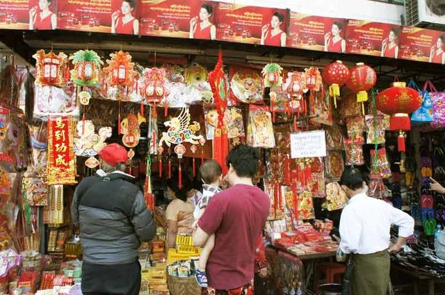 根据节庆的不同,不少本地缅甸民族店家也不失时机的将物品换成了春节货品售卖,而随季节不断更换贩卖物品的店家们也在本月不约而同卖起新年用品或食品,路边的大商店及药店,则利用有利位置在路口摆放琳琅满目的新衣或糖果。