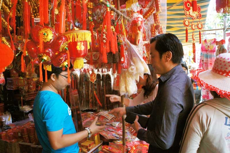 在路边现在以贩卖新年贡品为主的广东阿姨则一天到晚在应付络绎不绝的顾客,「现在我们华人都不分什么,没多少讲究了,我的顾客什么人都有」,她感叹现代年轻人已经不知道什么物品代表什么意义,有什么象征,像来自广东的新年红纸花,通常是广东人在新年时装饰在已故父母相框上的用品,「这个较多人买,福建人也会来买,看着好看,又喜气嘛」。一名福建妇女也说自己家里也用这花,包括不知代表什么意义的「金瓜银瓜」。