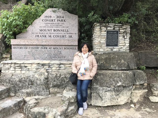 次日我们到市中心一Covert Park at Mt.Bonnel,拾级而上最高景点,可以俯瞰科罗拉多河(Colorado River)两岸风光,河流犹如玉带一条向前方延绵,两岸色彩鲜明豪宅别墅群,半现半掩、错落于绿树丛中,岸边还停靠着軽快小艇、加上秋后入冬、树木叶子变色交错,风光旖旎、一览无遗,站在山丘上,微风拂面、顿感心旷神怡。