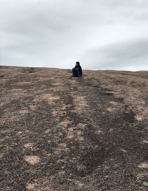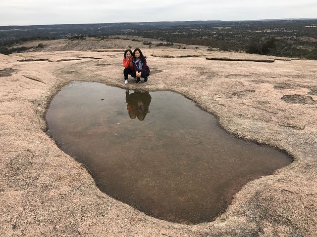 着魔岩(Enchanted Rock),是桃红色的巨型花冈岩、火成岩,是全美第二大的花冈岩残余山丘,一眼望去,半园形山丘起起伏伏、相连一座座,是攀岩者和远足队的最爱。我们到达后,由于好奇,也没想那么多,就跟随着年青人勇往直前,攀爬一段一休息,感觉体能还可以,直至山顶,天色己傍晚,遥望四周,景色美不胜收,岩顶上还有许多镶嵌如宝石般的极小湖泊,哇!不由惊叹浩瀚苍穹下竟有如此自然景观,不觉举手欢呼大喊几声、声音迥荡山峦间。
