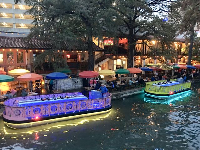 駆车约将近两小时,我们到了圣安东尼奥(San Antonio),它是一个较具异国风情的城市,古色古香、带有浓厚的浪漫色彩。首先,我们参覌了有名的阿拉莫(The Alamo)战役遗址,那是德萨斯州移民为争取独立自主和墨西哥军队惨烈激战之古迹;然后又漫步河滨步道(San Antonio River Walk),此处是德州第一娱乐胜地,游客如织,河边聚集了飡馆、酒吧、商店、娱乐场所和五星级酒店……等等,还有水上来往穿梭游船,载着覌光客徐缓环绕游览,岸边夜景明暗参半、灯光闪烁、五光十色,静谧中呈显热闹,令人留连忘返。