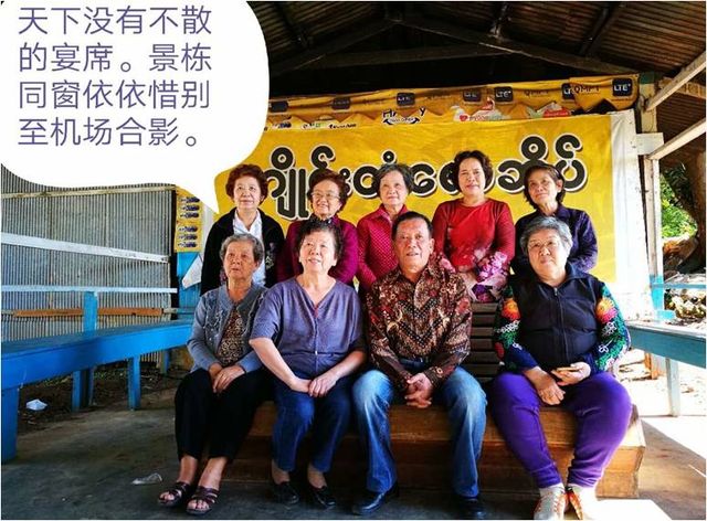 景栋机场,昔日的椰树叶搭盖的机场候机室已建成砖瓦房。从大其力特意赶来会面的同窗徐素仙、冯爱华、徐秋娥,居景栋的徐友青、罗新玉已在机场迎候。领取行李,徐素仙付小费,行李工将行李搬至徐友青侄子驾驶的车上,即到“金世界”酒店下榻。
