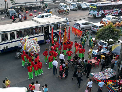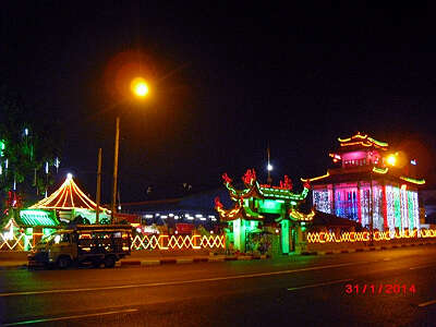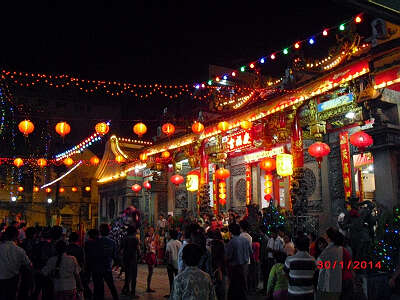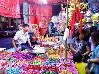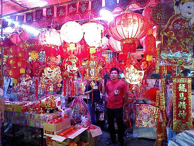 锣鼓一声除旧岁。随着舞狮队大鼓声响,已经拉开甲午年春节活动帷幕。腊月廿三日,按旧习俗是过小年,小伙子们早已按捺不住,大鼓咚咚响起来,瑞狮闻声醒起来,“春”来了。大街道上各个商店,早已摆满年货,挂满大小红灯笼、各样春联迎风招展,连小摊上也摆满大小红包纸袋。放眼望去,广东大街华区路段,一片红色海洋。华人过节,处处洋溢浓浓中华文化气息,从1月27日开始,广东大街华区路段的大道上,大小汽车只限靠半边车道行驶,另一半边车道则划为春节街市,曰以夜继,至到除夕日,每到晚上,各个摊位挑灯夜战,和商铺高挂的LED招牌,互映辉煌,五颜六色,绚丽多彩,早把华区换上节日盛装。