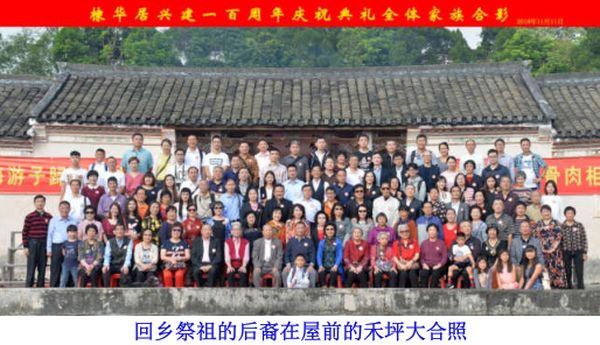 夫婿丘文发的祖家位于广东省梅州西阳镇白宫新联村,屋名《棣华居》,建于1918年,是典型的客家围拢屋,2002年被评为广东省文物保护单位。今年是祖屋落成100周年,国内外后裔相约于2018年11月11日回巢祖屋祭祖举办百年庆典。