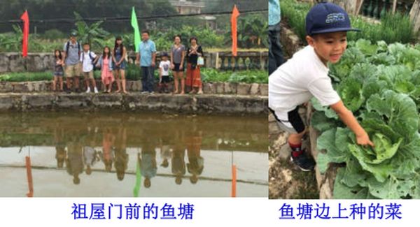 鱼塘边上种的大甘蓝菜真大;拜祭前燃放爆竹,对着比脸盆还要大许多的炮仗盒一脸好奇;给祖先烧的高香每支如同小竹竿那么粗大也是第一次所见。孩子们拜完祖先后就在各厅堂通廊到处参观,讲出的一句话就是“So amazing”。