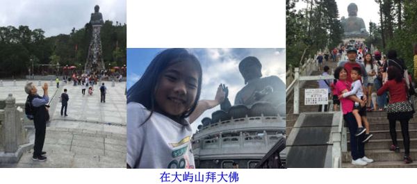 东方之珠---香港,我们来此探亲兼旅游, 拜访了朱家目前唯一的老前辈---85岁高龄的七婶。乘坐方便快捷的地铁往东涌,排队坐缆车上大屿山拜大佛。每辆缆车安排坐8位乘客,我们全家大小可一同挤在一个车厢,一同享乐。缆车上山时,左手边可望见远处昂坪山顶上的大佛,右手边可遥望到最近才通车的港珠澳大桥。缆车票价港币235元花得不心疼。上到山上,空气清新,风景秀丽,天坛大佛庄严宏伟(据说是世界第二大的户外坐佛),在这里可自然放松心情,可体验美丽的大自然的气息。孩子们兴致勃勃地爬上260级石阶去朝拜23米高的大佛,并尝试和大佛合掌拍照。