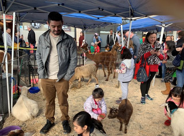 当我上午11:00前赶到山谷大道现场,周围的大街小巷停满了车辆,好不容易找到一个空位,匆匆步入园区,首先收入眼簾的是小动物园,六,七岁大的孩童在骑矮种马,显得十分得意。旁边更热闹。园内有羊妈妈护着羊宝宝。小花猪和小黑猪,摇着尾巴穿来逛去,一刻不停。小卷毛乌鸡,跳来跃去寻找食物。可爱的小兔子奔的奔,蹲的蹲。旁边有两只羊驼,怕脚踢游客,特地把它们围住,有点受限。这可是两三岁小孩们的乐园,只见家长们手牵孩子购买食料碗,入内让孩子们零距离喂食摸身,欢乐无比。