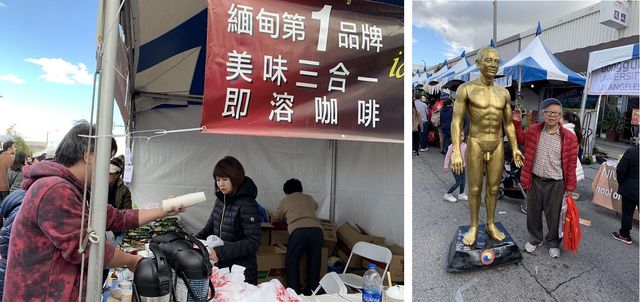 往前走是舞台,台上高歌翩舞,台下掌声响亮,1300华语电台现场主持。接着是一排排帐篷望不到尽头,一个个摊位摆满货品,琳琅满目。红光金色年货,盒装纸袋食品药物,电器,洁水器,网络,影视,花卉盆栽,旅游业,医疗看病,应有尽有,唯独书刊光碟,已被淘汰。游客们携老带幼,擦肩接蹱,拥挤不堪。突然眼前出现缅甸商摊,廉价出售三合一速溶咖啡红茶,笔者大喜,一口气买了十几包。接下去是各种食品摊位。观赏购物的,游戏抽奖的,饮食填肚的,测试身体的,摄影留念的。对于年长者,一排排移动式厕所,大大方便如厕。