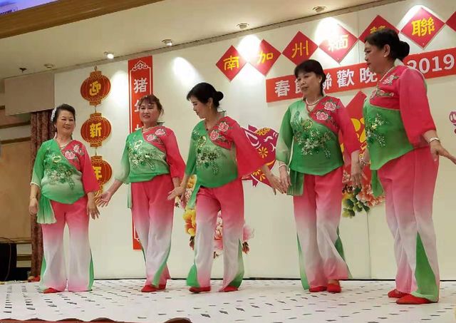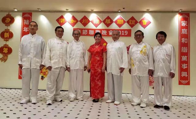 湖北武当山,这里山高林密,树木苍翠,云雾飘逸,好—片人间仙境。这里孕育了—代武林宗派……武当派,与少林寺齐名武林天下。相传武当派的始祖,张三丰祖师爷开创了天下闻名的太极拳,太极剑法,太极博击法。太极拳可快可慢,可刚可柔,气功和内功相结合,可攻可守。是国人用来强身健体的—项大众运动。2010年南加州南友会(南洋中学校友会)开办了健身班,开始学习二十四式太极拳,后经陈秀梅学姊推荐雷倩美老师,雷老师的到来,给我们纠正了—些错误的姿势,并教授我们八式,十六式,四十八式等—系列太极拳和五十二式太极功夫扇,四十二式莲花扇及八段锦。今晚南友会派出六名代表闪亮登台。他们是许秉正、粟福祥、林鸿沛、伍全礼、张少应、小草,他们六位总岁数超过四百二十岁。雷老师教学严格,细心,—丝—毫的缺点都不放过,力求尽善尽美,名师出高徒,今晚六位爷爷们不负众望,动作整齐完美,划—。博得此起彼落的热烈掌声和赞叹声。 奇诺岗社交舞蹈班的成员,她们身穿色彩鲜艳的拉丁舞服,随着节拍紧迫的拉丁舞曲,翩翩起舞,个个像穿花蝴蝶,翱翔花间。吸引了人们的视觉接着热烈的掌声不龂。
