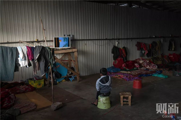 2019年2月25日,清晨上工后,20多人聚集的大通铺宿舍里,只剩孩子在看电视。